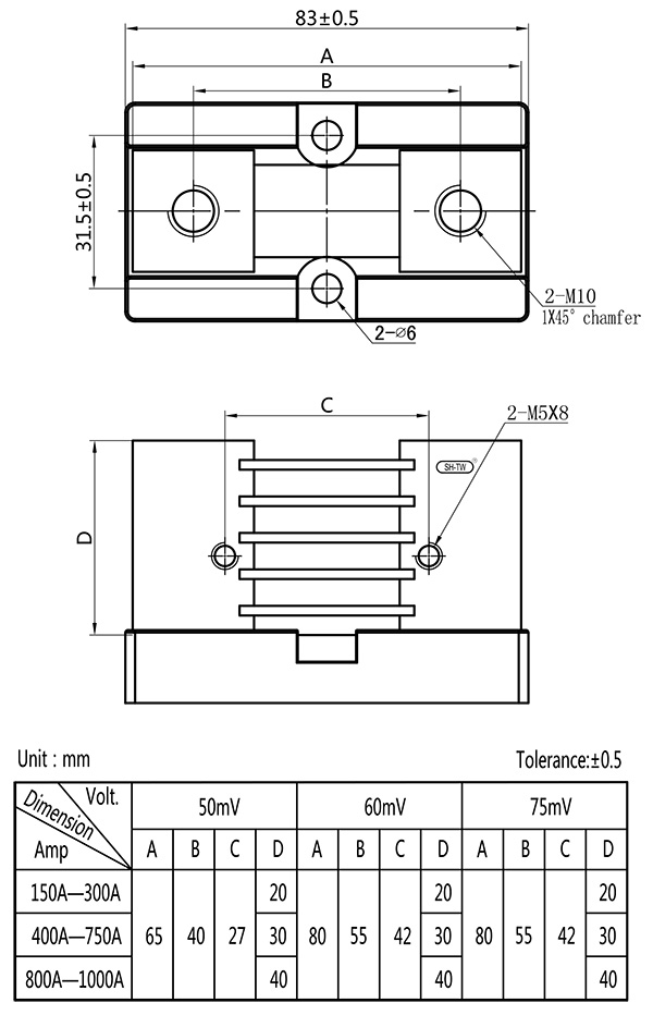 • .Temperature rise: Electrify the shunt with rated current for 2hr, test it after temperature rising stable, the temperature rise should be≤80K when the rated current under 100A; and should be ≤120K when the rated current higher than 100A.