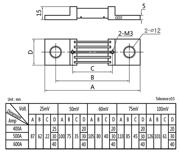 • .Temperature rise: Electrify the shunt with rated current for 2hr, test it after temperature rising stable, the temperature rise should be≤80K when the rated current under 100A; and should be ≤120K when the rated current higher than 100A.