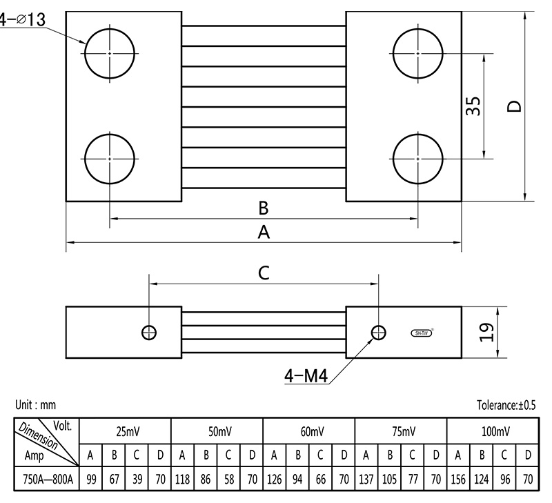 • .Temperature rise: Electrify the shunt with rated current for 2hr, test it after temperature rising stable, the temperature rise should be≤80K when the rated current under 100A; and should be ≤120K when the rated current higher than 100A.