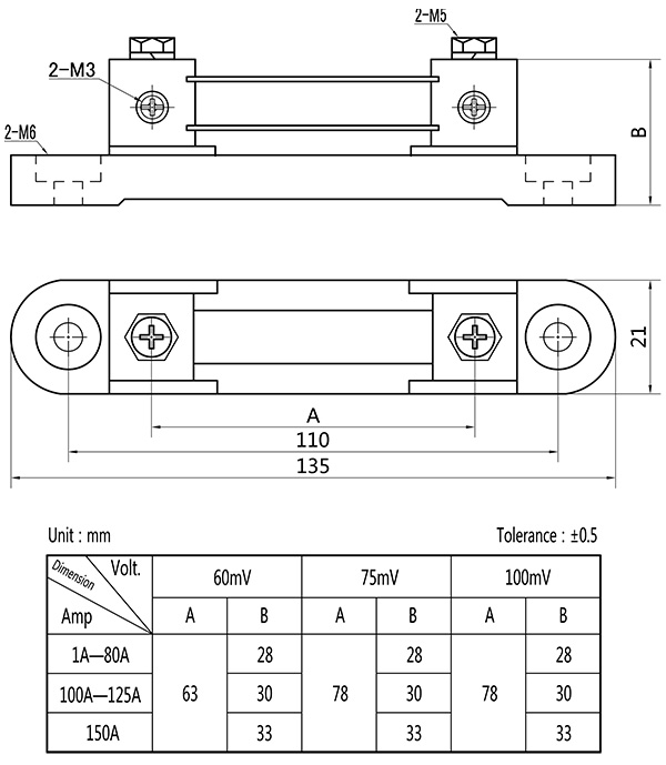 • .Temperature rise: Electrify the shunt with rated current for 2hr, test it after temperature rising stable, the temperature rise should be≤80K when the rated current under 100A; and should be ≤120K when the rated current higher than 100A.