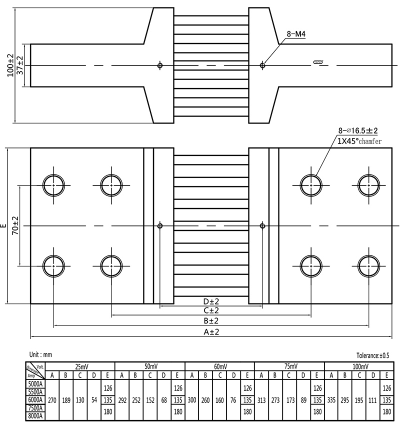 3)Temperature rise: Electrify the shunt with rated current for 2hr, test it after temperature rising stable, the temperature rise should be≤80K when the rated current under 100A; and should be ≤120K when the rated current higher than 100A.